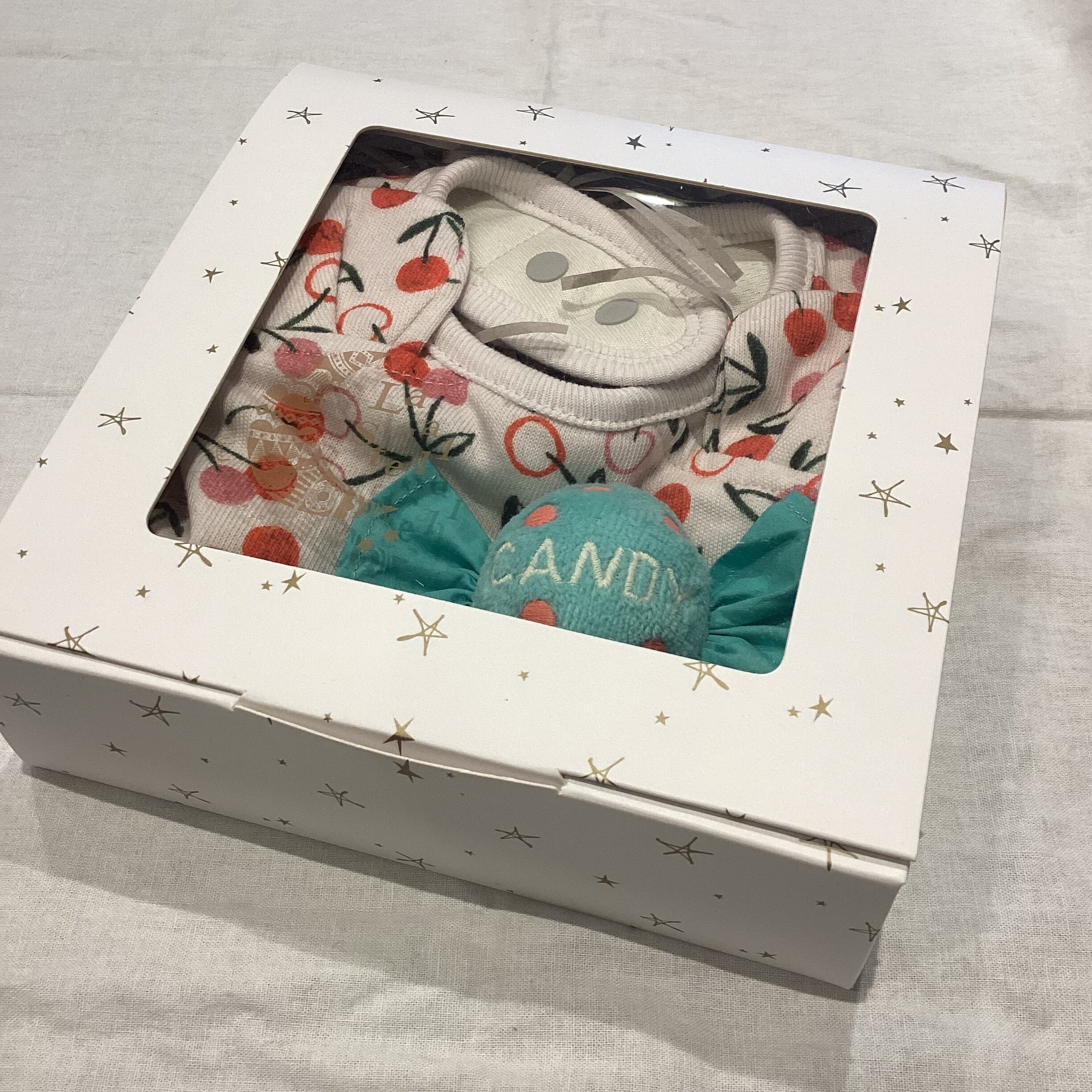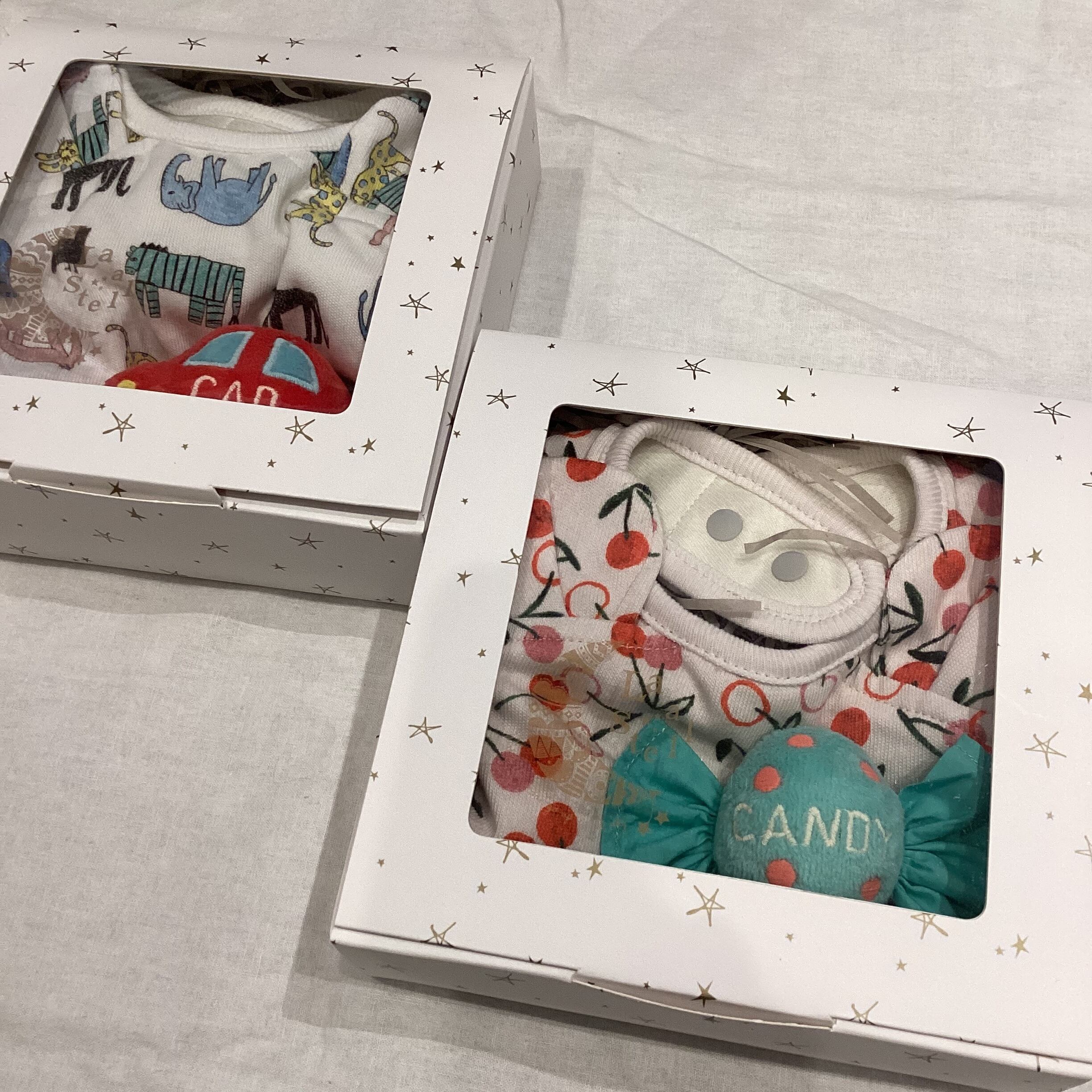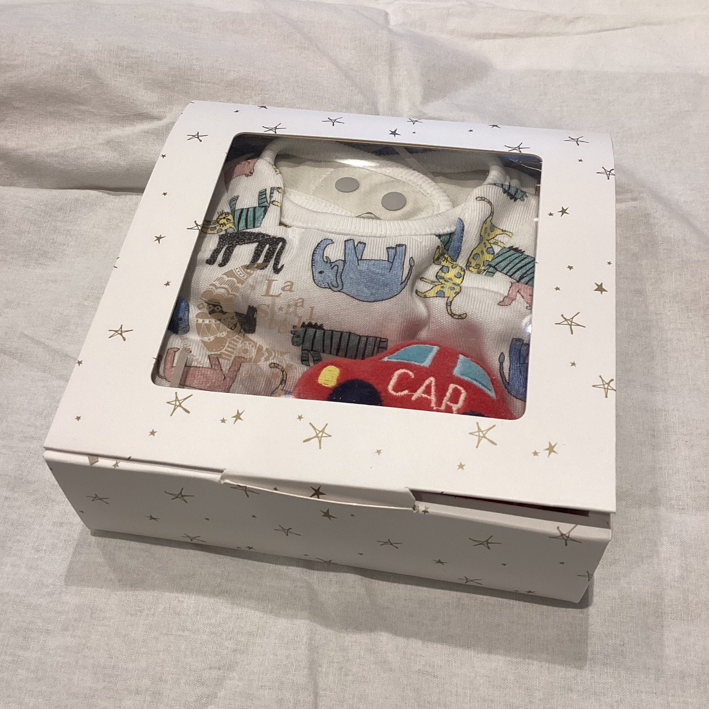 かわいらしいスタイとラトルがセットになったギフトボックスです。おしゃれで実用的なアイテムが揃っており、大切な赤ちゃんに喜ばれること間違いなし!