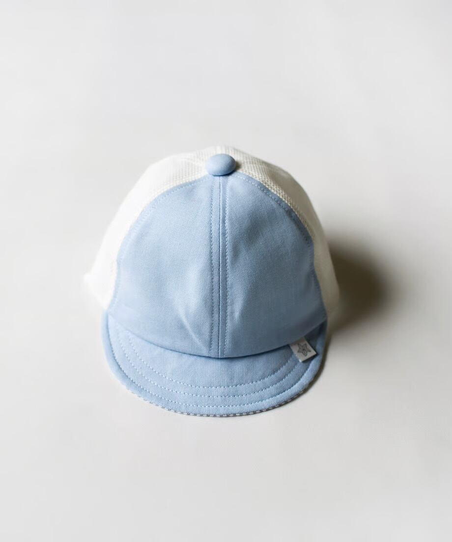 デニムダンガリーの素材感と、後ろのメッシュが涼しげな日本製ベビーキャップです。