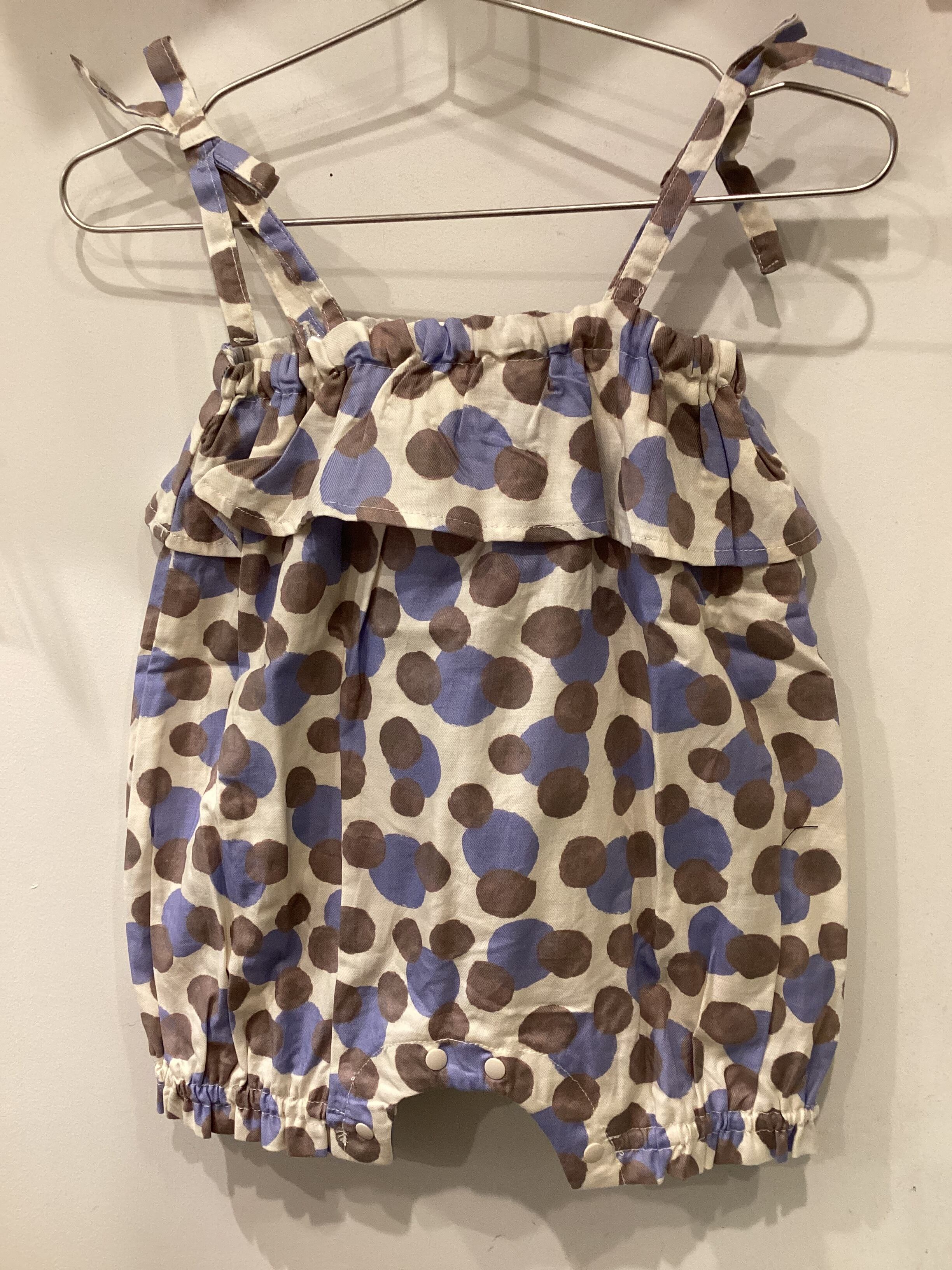 可愛らしいドットデザインが魅力的なベビーウェア!優しい肌触りの綿素材で作られており、快適さを追求しました。キャミソールタイプのロンパスは、夏の暑い日にもぴったりな通気性があります。