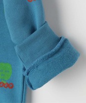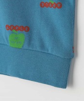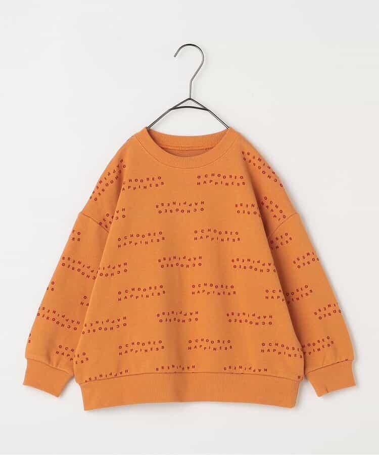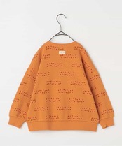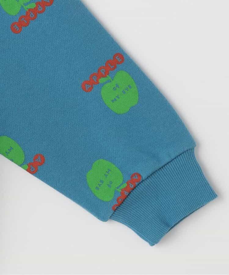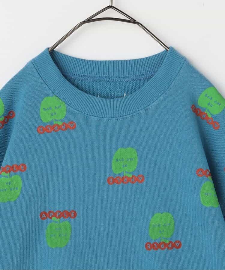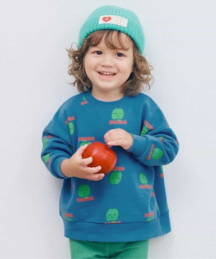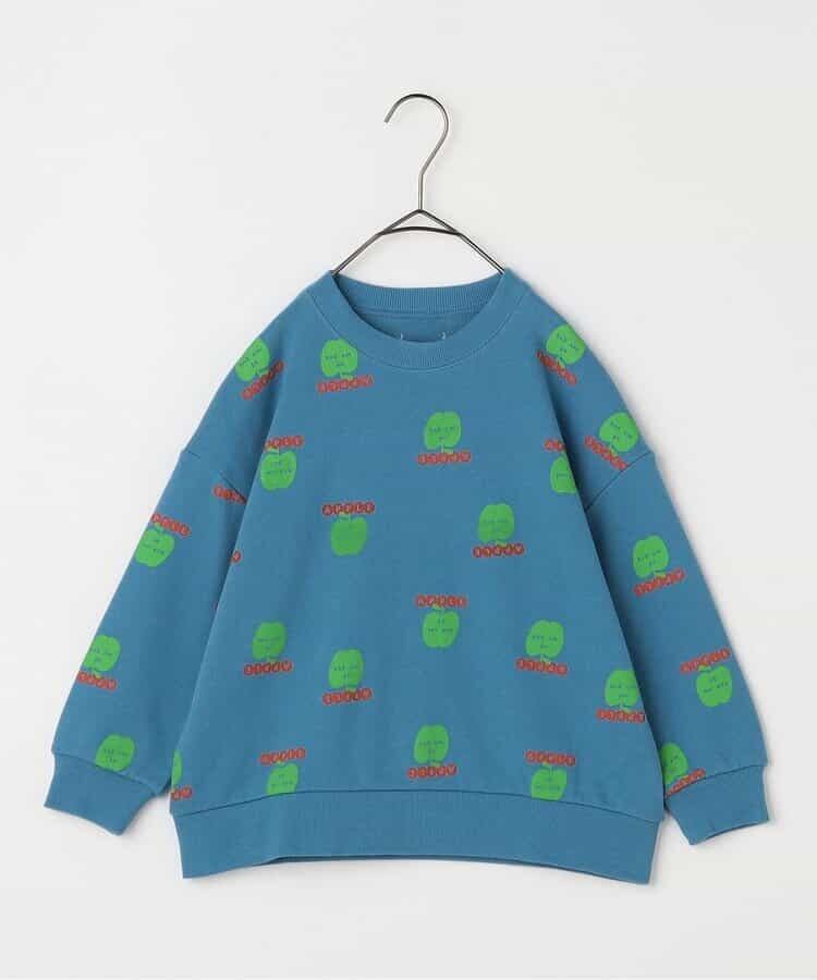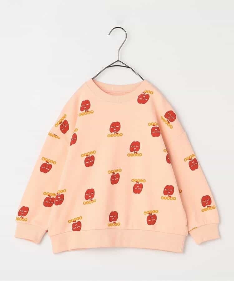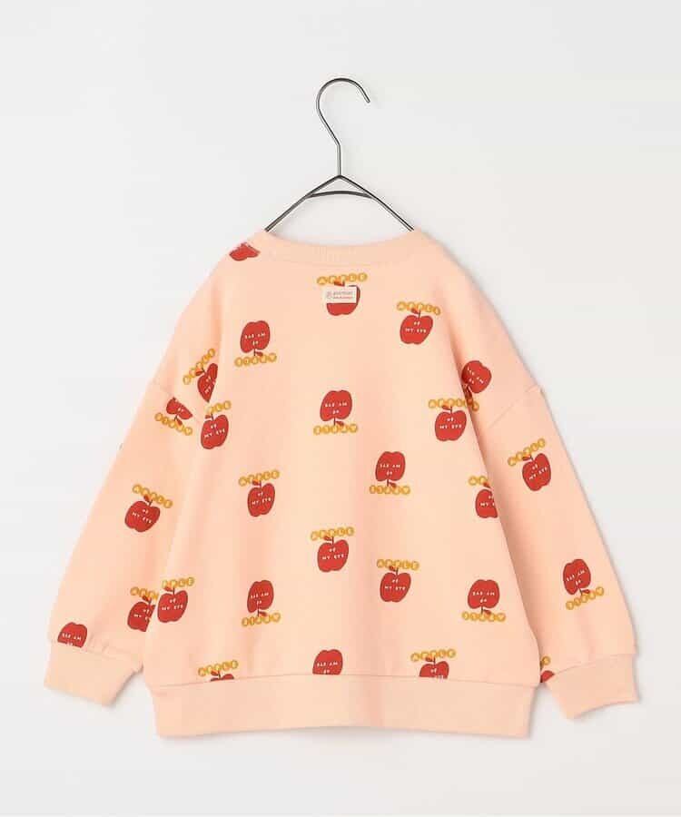 リンゴとロゴの総柄がカラフルでかわいいトレーナー。