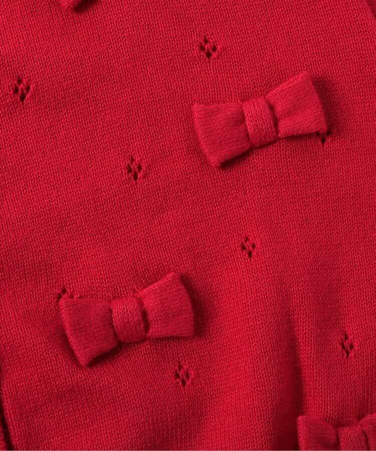 柔らかなニット素材で仕立てたカーディガンに、本体と同素材の小さなリボンを添えました。