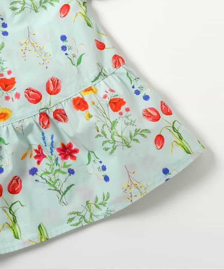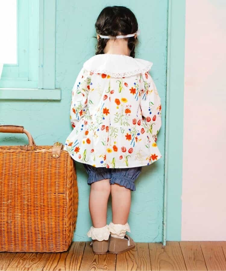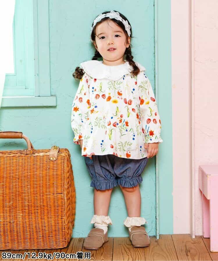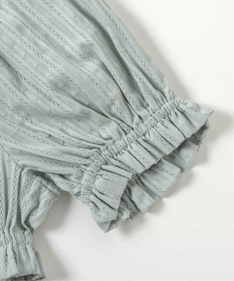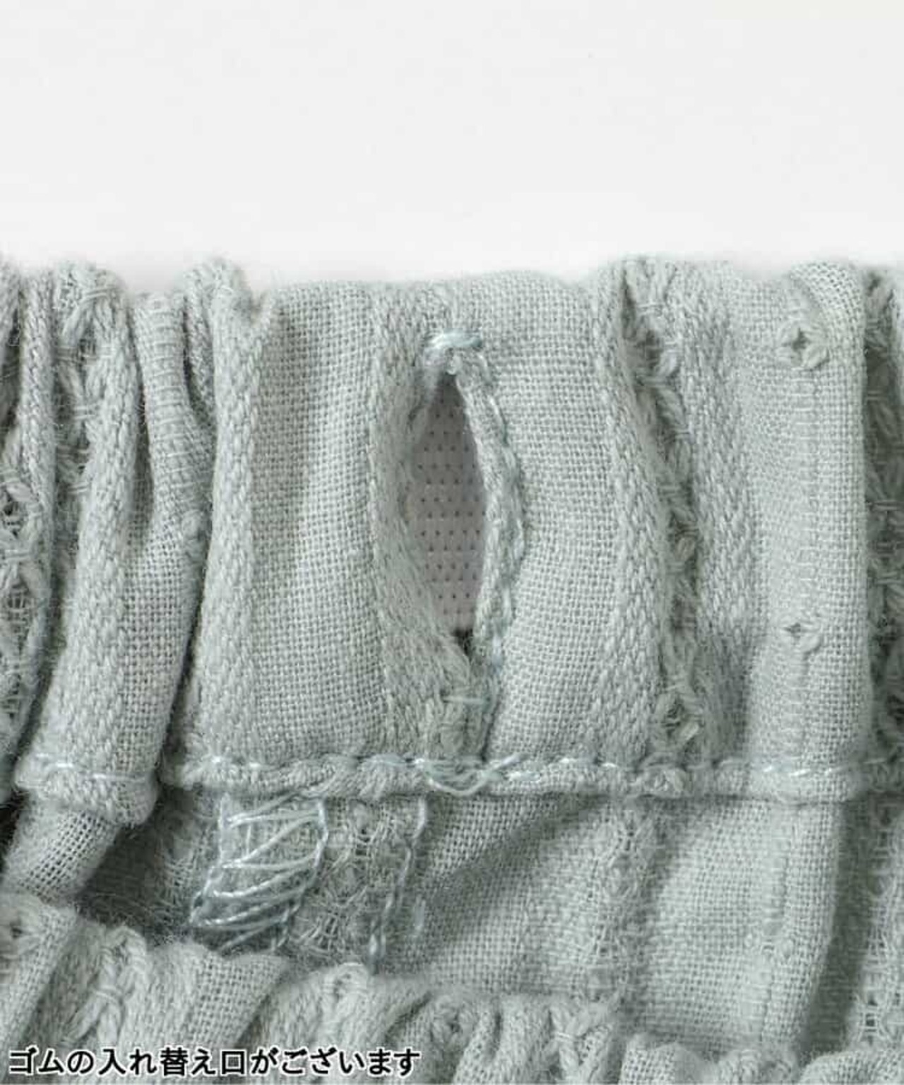 トップスは上品に見えるフレアシルエットで、ボトムはオフホワイトにはダンガリー素材、サックスにはトップスと同色のストライプ織を使用。