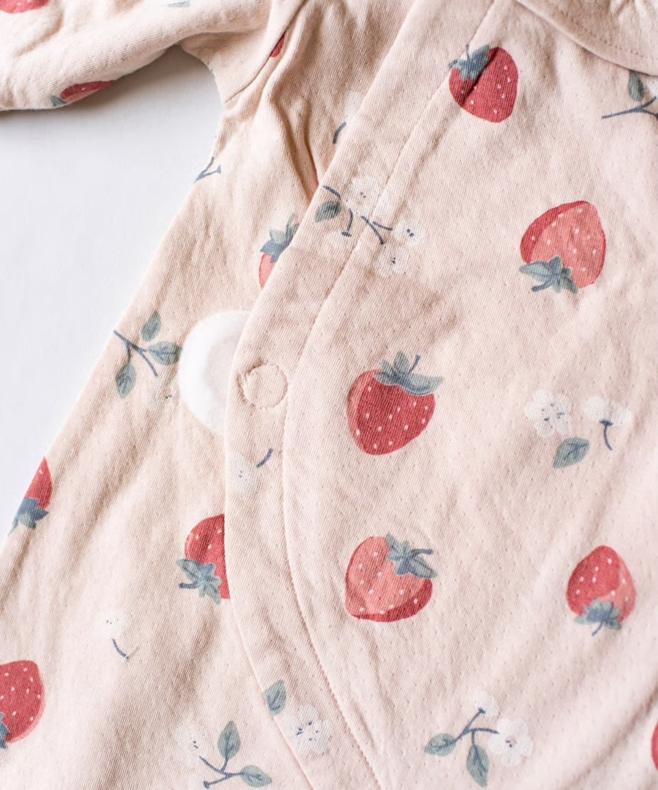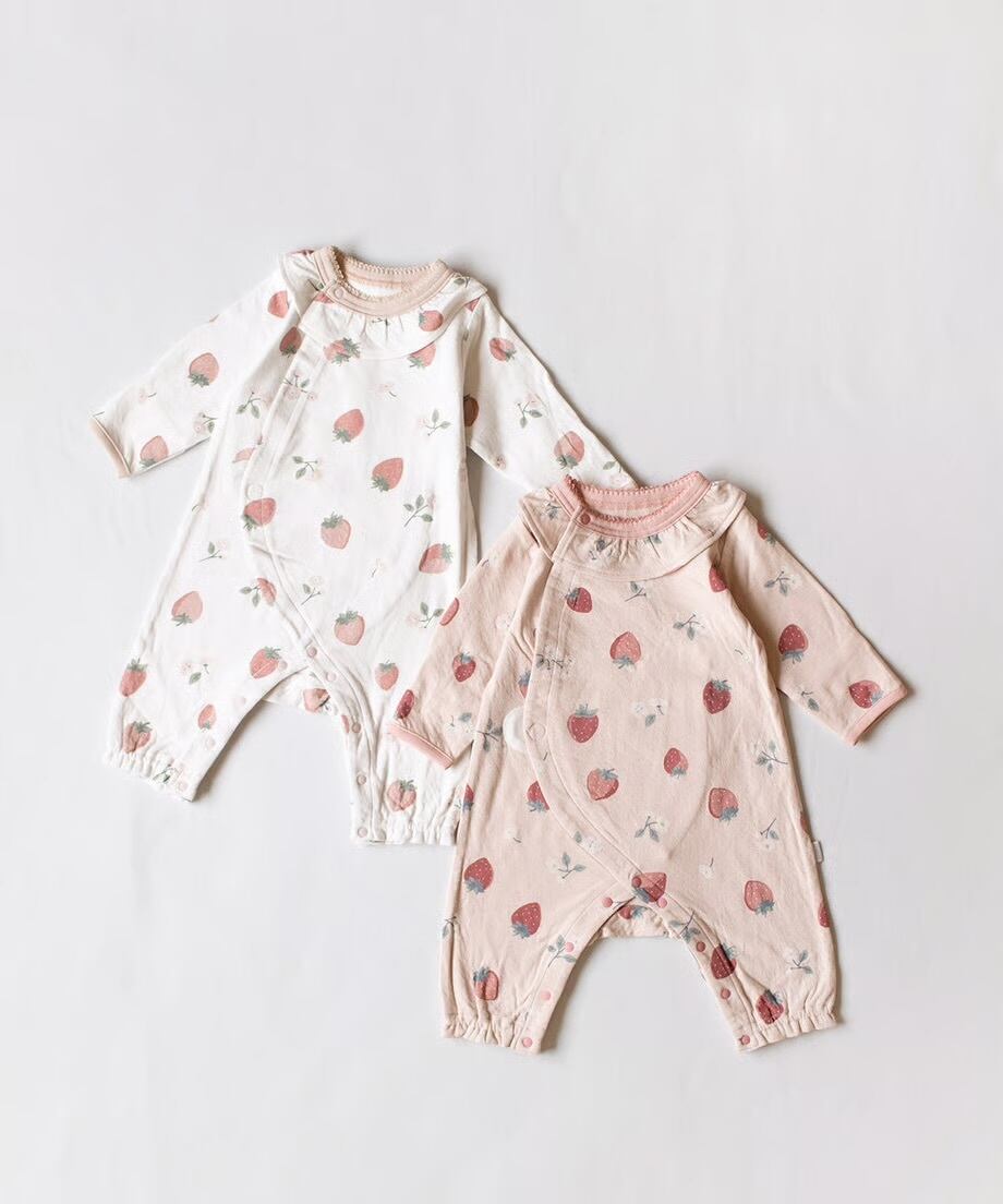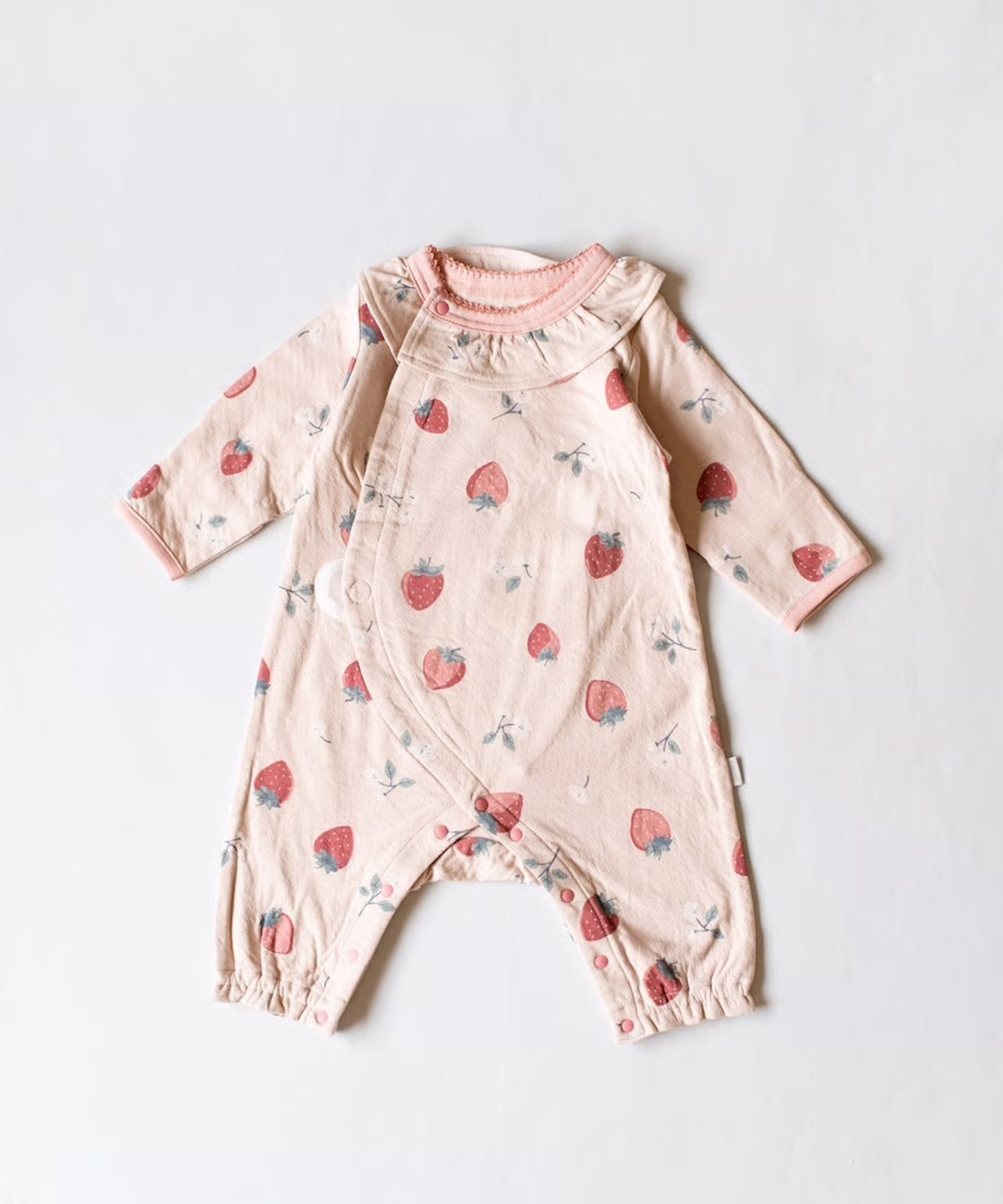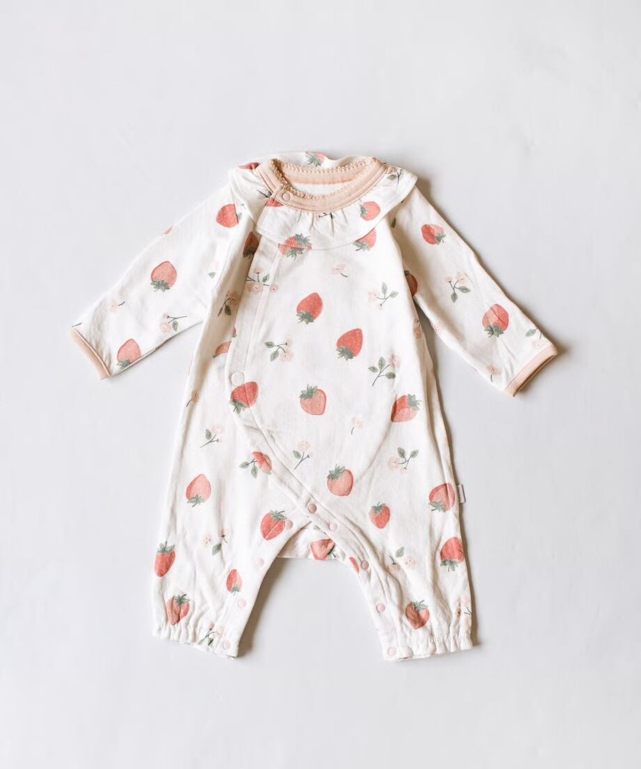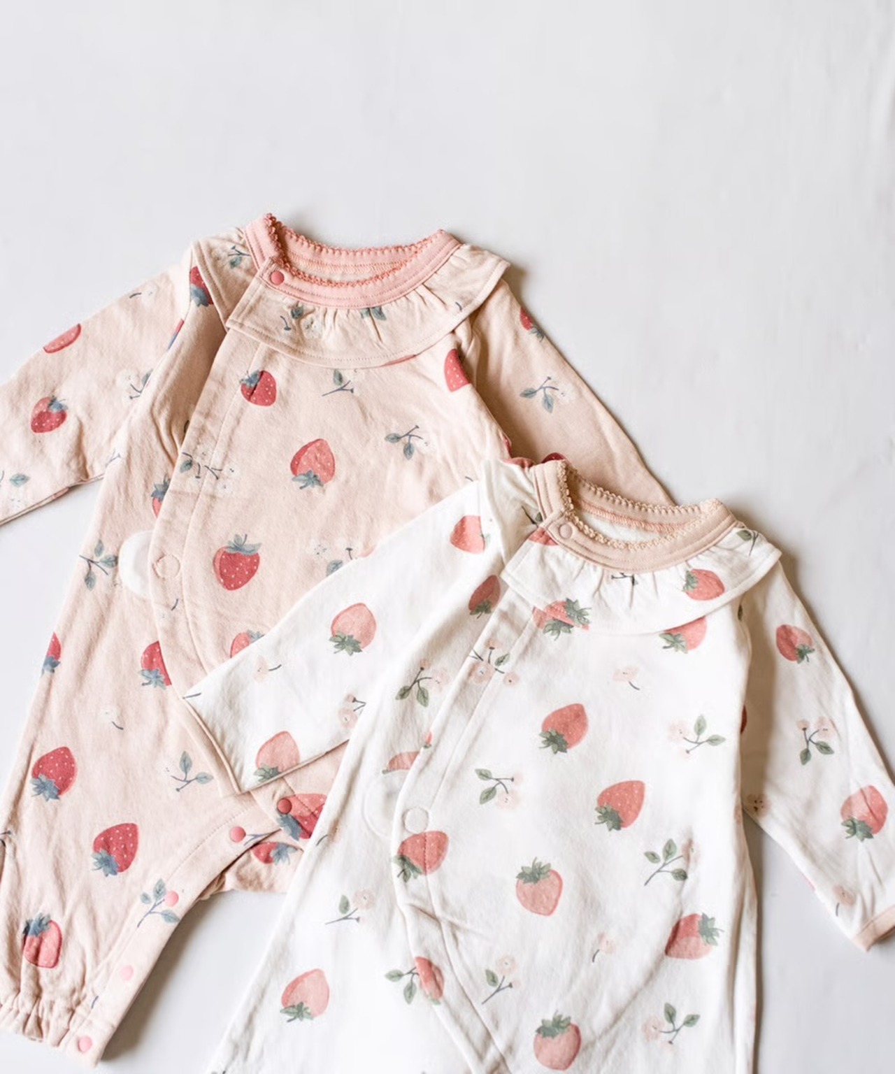 美味しそうなもぎたてのいちご柄をプリントしたベビーロンパースです。