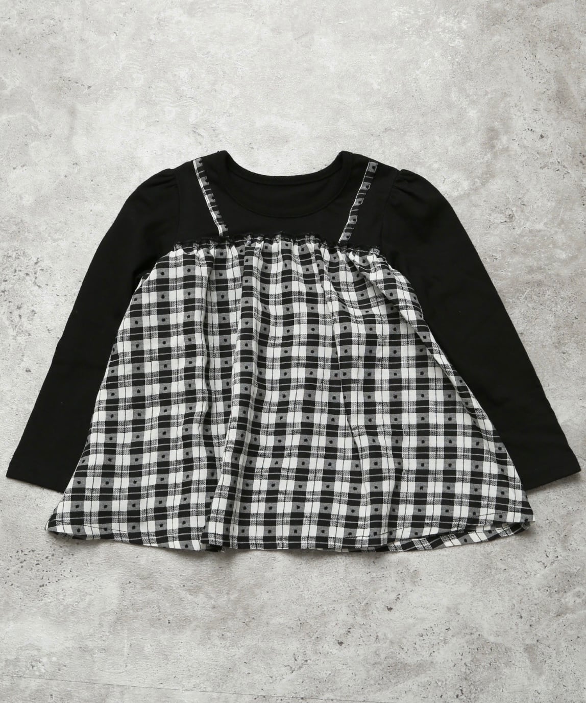 トップス部分とキャミ部分がドッキングされた1枚で、重ね着風の可愛いスタイルが簡単に完成します。
