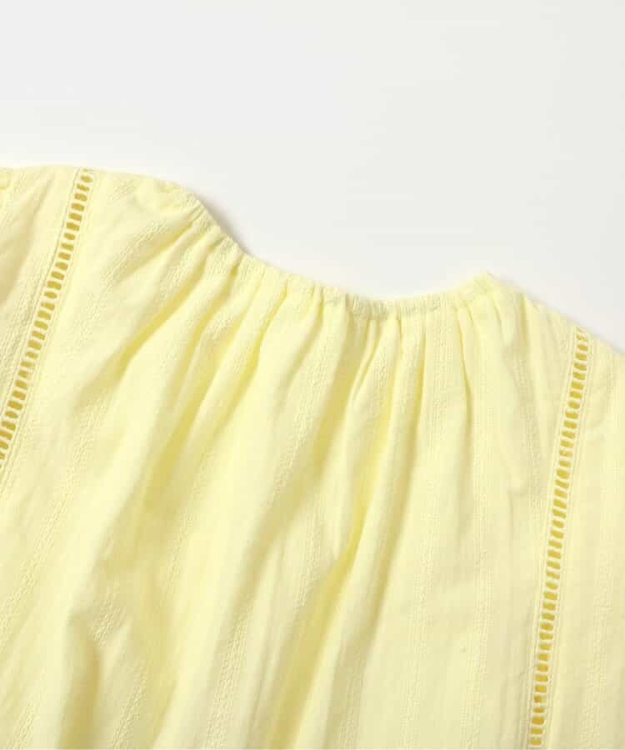 表情のあるストライプ織に、前後にはしごレースをあしらい、優しい印象に仕上げました。