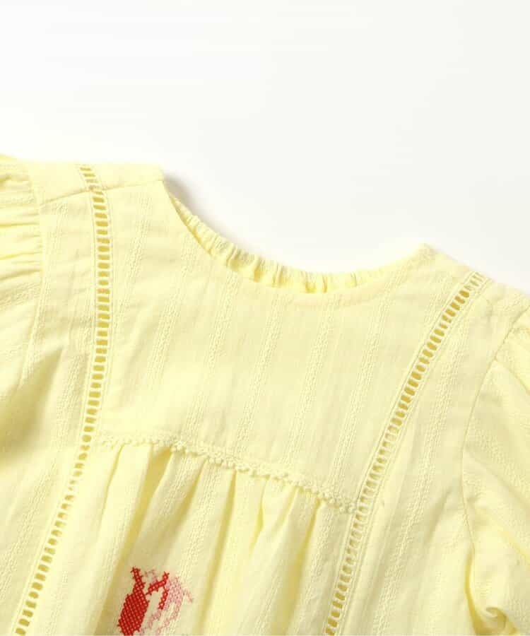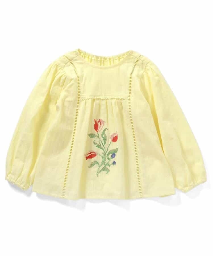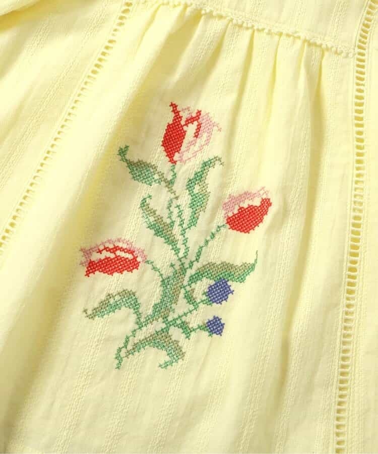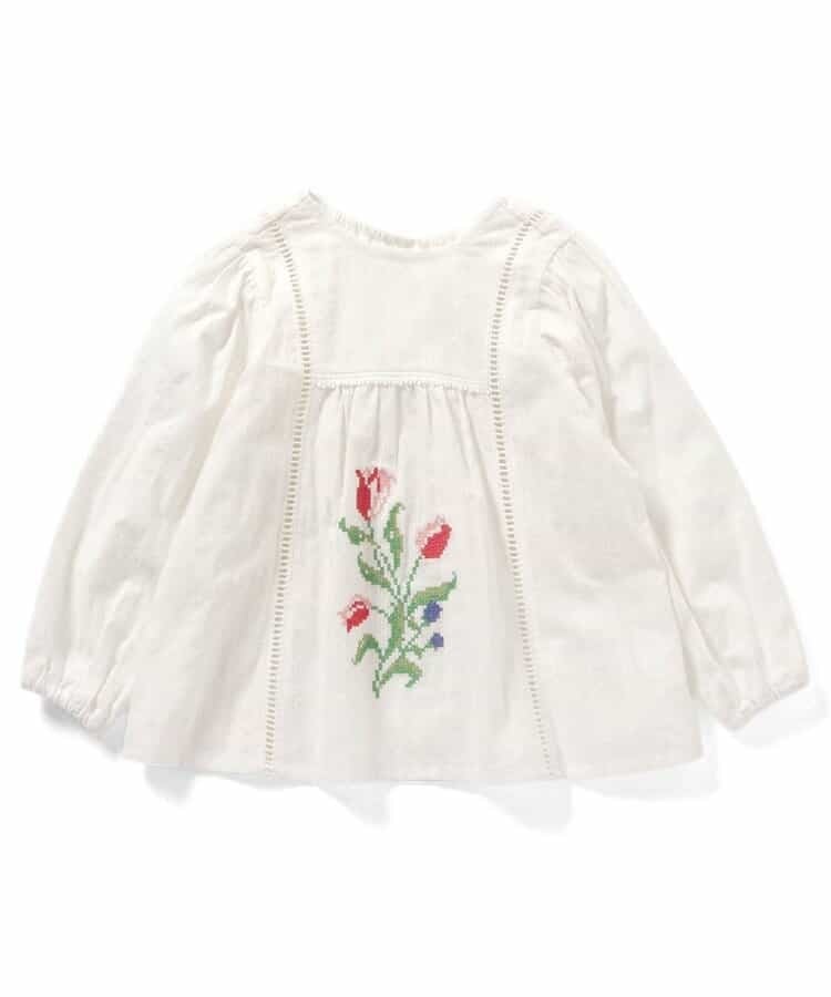 オランダのチューリップをモチーフにしたクロスステッチ刺繍がかわいいノーカラーブラウス。
