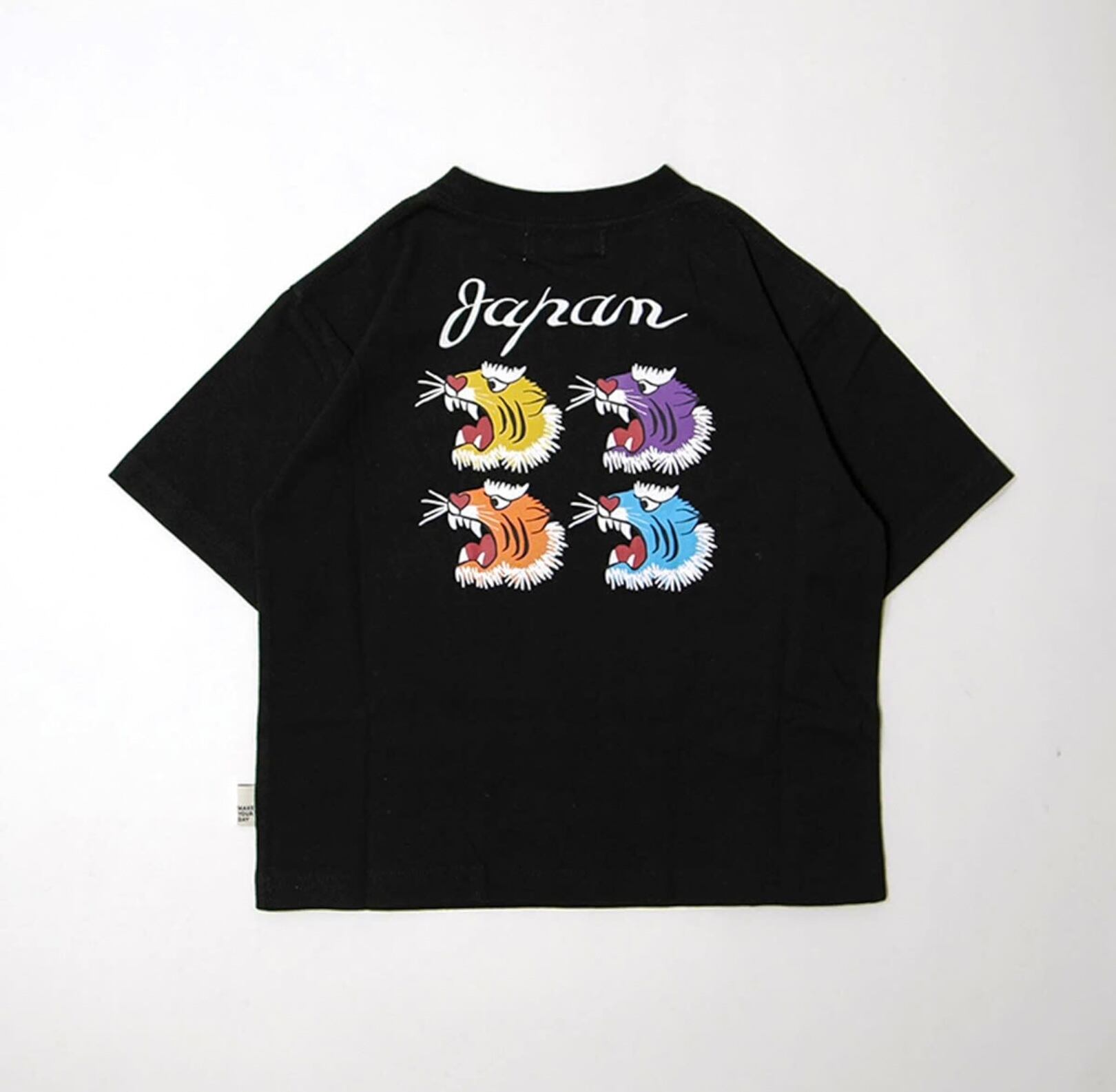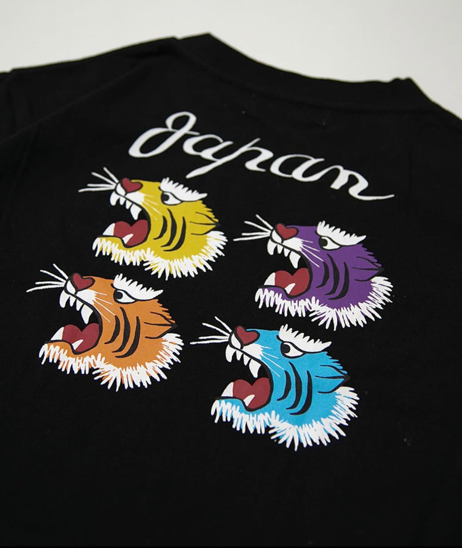カラフルな4匹のトラが背中にプリントされたTシャツ。